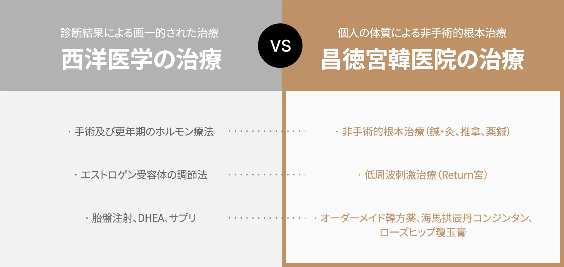 画⼀化された診断結果により注射やホルモン療法で治療する⻄洋医学の治療法と違い、